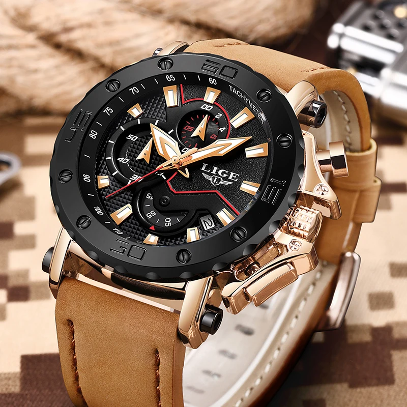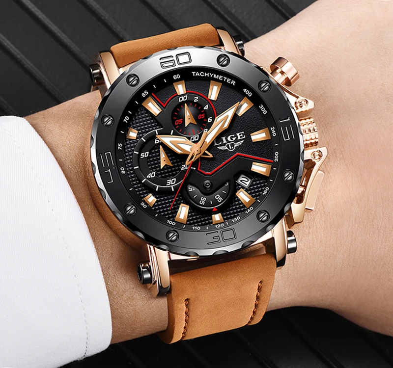 HOT SALE LIGE Men Watches Male Business Date Chronograph Waterproof Quartz Watch Men's Casual Leather Large