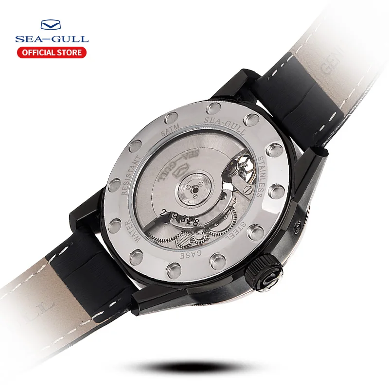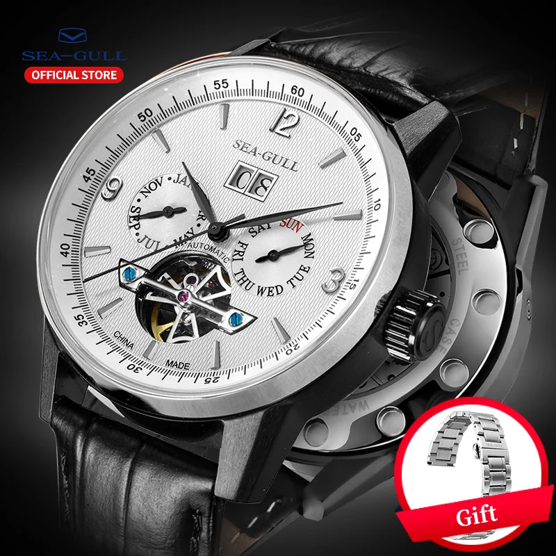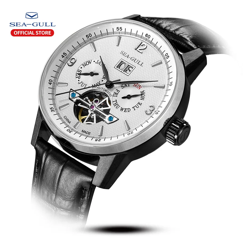 Seagull Business Watches Men's Mechanical Wristwatches Calendar Week 50m Waterproof Black Leather B